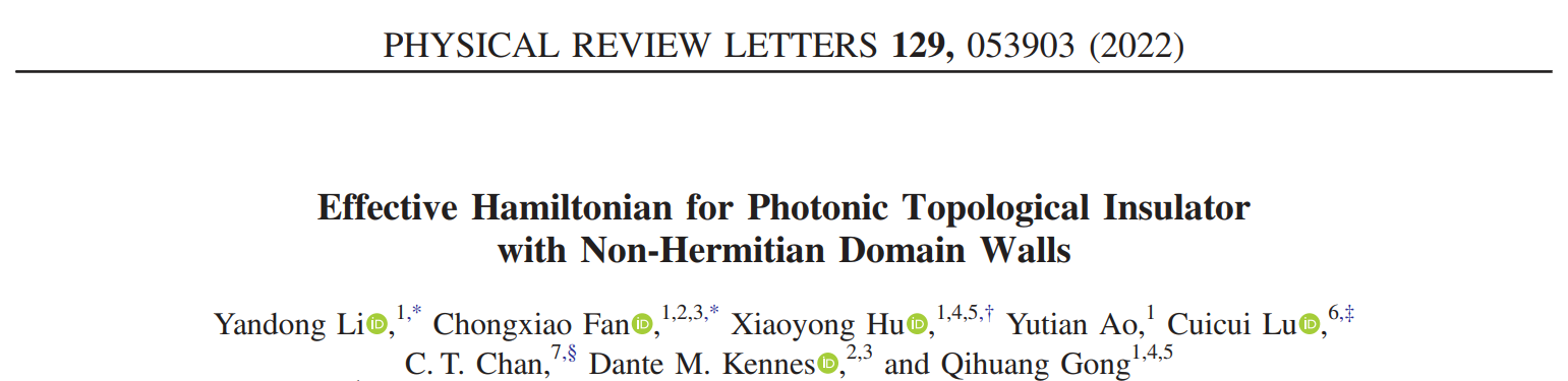 Yandong Li,# Chongxiao Fan,# Xiaoyong Hu,* Yutian Ao, Cuicui Lu*, C. T. Chan,* Dante M. Kennes, and Qihuang Gong, Effective Hamiltonian for Photonic Topological Insulator with Non-Hermitian Domain Walls, Physical Review Letters 129, 053903 (2022).