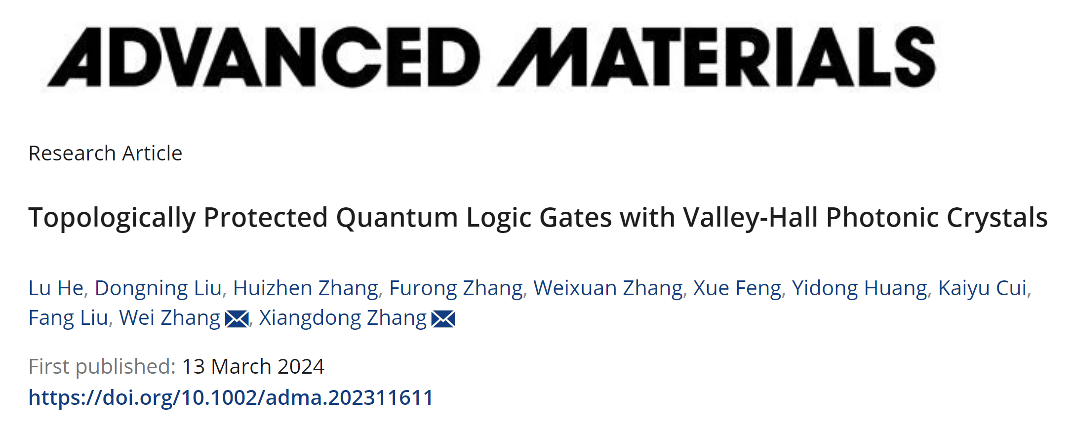 日前,北京理工大學物理學院張向東教授課題組與清華大學電子工程系黃翊東教授課題組開展合作,基于谷拓撲光子晶體平臺,實驗實現(xiàn)了拓撲保護的光量子邏輯門。相關成果以“Topologically Protected Quantum Logic Gates with Valley-Hall Photonic Crystals”為題發(fā)表在Advanced Materials期刊[Adv. Mater. 202311611 (2024)]上。該工作得到了國家自然科學基金委和國家重點研發(fā)計劃的大力支持。北京理工大學物理學院何路博士(現(xiàn)為光電學院特立博士后)為該論文的第一作者,北京理工大學物理學院張向東教授、清華大學電子工程系張巍教授為論文共同通訊作者。另外,清華大學電子工程系博士生劉東寧、馮雪副教授、崔開宇副教授、劉仿教授;北京理工大學張慧珍副研究員、博士生張福榮、張蔚暄研究員也對此工作做出了貢獻。