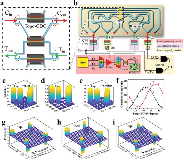 為了測試CNOT門,研究人員搭建了相應的實驗裝置,如圖3b所示。首先在片外通過自發(fā)四波混頻過程生成了頻率簡并的光子對。實驗測試表明量子源的Hong-Ou-Mandel干涉的可見度為99.61%。隨后,光子在自由空間中被編碼為偏振基的量子邏輯比特。光子的偏振態(tài)可以通過態(tài)準備模塊進行任意調(diào)控,該模塊包括一組波片,即四分之一波片(QWP)和半波片(HWP)。為實現(xiàn)CNOT門,考慮在ZZ基礎下的操作測量。控制(目標)量子比特定義為image4.pngimage5.png( )。編碼光子通過二維光柵注入到芯片中,二維光柵可以將自由空間中的偏振編碼光子轉(zhuǎn)換為芯片內(nèi)的路徑編碼光子態(tài)。通過在topo-CDC中發(fā)生的兩光子干涉實現(xiàn)CNOT功能。在這種情況下,輸出量子比特可以通過包含HWP,QWP,偏振分束器(PBS)和光纖耦合的超導納米線單光子探測器(SNSPD)的態(tài)層析模塊進行測量。