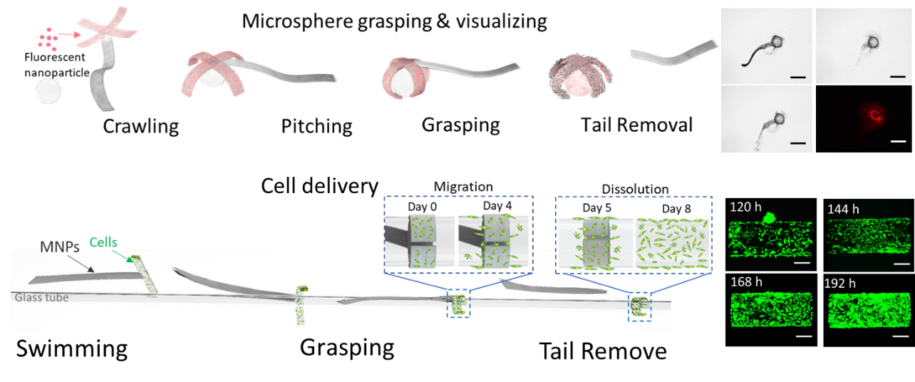 通過模塊化軟體微機器人制造方法,團隊設計了經(jīng)典的條狀微機器人本體結構,并為其不同模塊區(qū)域搭載了磁性納米顆粒、造影劑(如微泡和熒光納米顆粒)、功能性細胞、靶向藥物等不同物質,使其能夠兼具磁驅動、封閉空間顯影反饋、靶向作業(yè)等性能。通過賦予微機器人本體不同模塊特定的形變模式,使其能夠感知生物活體環(huán)境中變化的體液離子濃度與pH值,發(fā)生局部區(qū)域同軸、異軸形變并通過磁驅動模仿毛蟲蠕動、魚類擺尾,實現(xiàn)運輸、投遞、移植、回收、降解等多序列復雜任務,有望在未來個性化靶向醫(yī)療中大展拳腳。