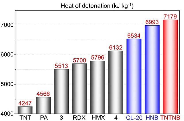 為了解決這一挑戰(zhàn),龐思平課題組創(chuàng)新性提出全硝基硝氨基協(xié)同策略,設計并合成出全硝基硝氨基取代的1,3,5-三硝基-2,4,6-三硝氨基苯化合物(TNTNB,圖1),突破了CHON系含能材料能量難以提高的瓶頸。其爆熱高達7179 kJ.kg-1,遠高于HNB和CL-20為代表的第三代含能材料(HNB的爆熱為6993 kJ.kg-1,CL-20的爆熱為6534 kJ.kg-1),是目前能量最高的有機炸藥(圖2)。與HNB相比,TNTNB在水、酸、堿等溶液中都能夠長期穩(wěn)定存在,具有更高的穩(wěn)定性。并且,發(fā)展乙酰化活化-硝化方法,在國際上首次實現(xiàn)對超惰性含能化合物三氨基三硝基苯(TATB)的硝化,成功攻克這個已困擾含能材料化學領域多年的技術難題。該研究成果為解決含能材料高能和安全之間的本質矛盾,設計發(fā)展新一代高能材料提供了新的思路和路徑。