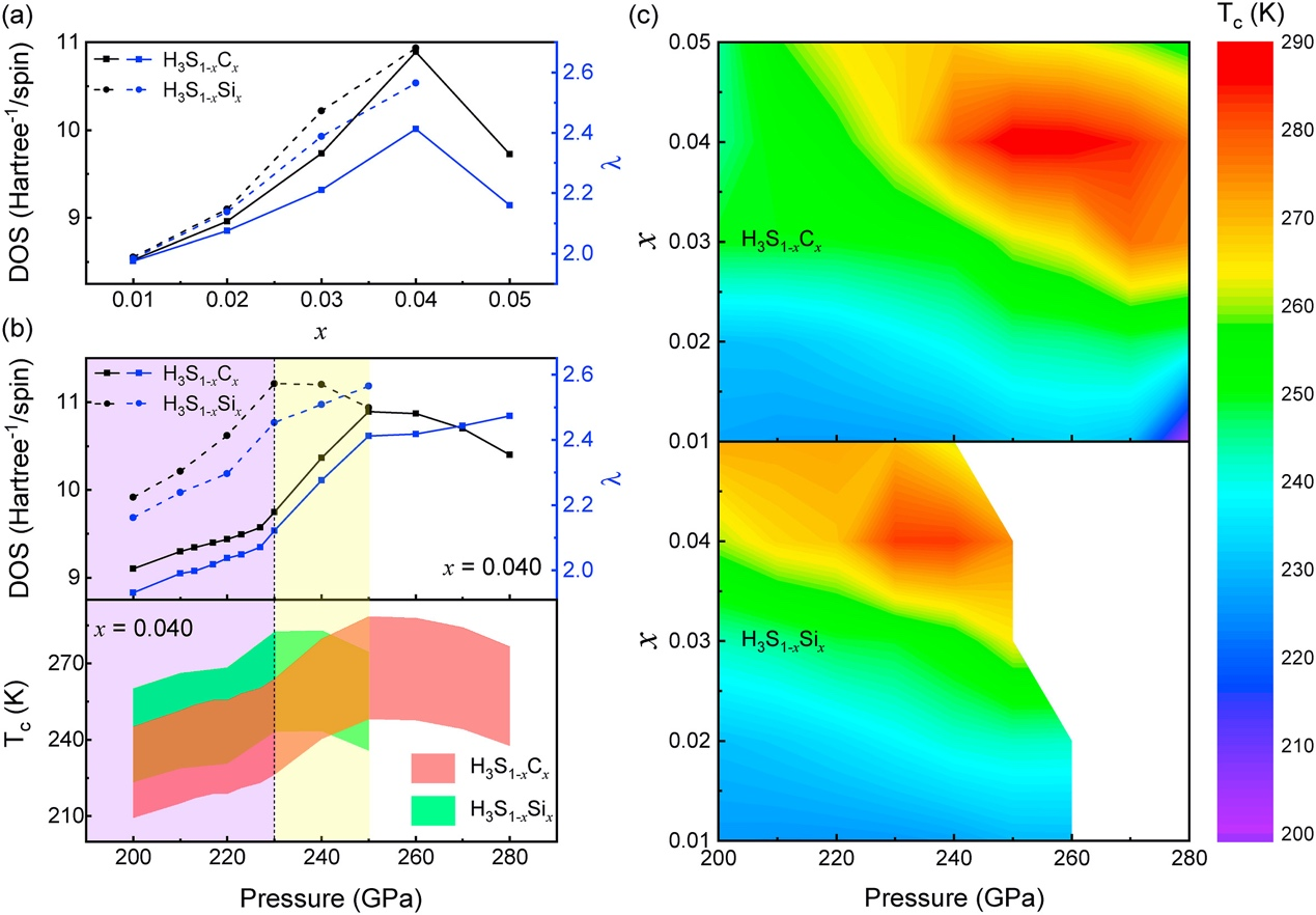 圖2 (a) H3S1-xZx @250GPa (Z=""C,"" Si)的DOS和電聲耦合常數。(b) H3S0.960Z0.040的DOS、電聲耦合常數和超導相變溫度。(c)超導相變溫度分布圖。