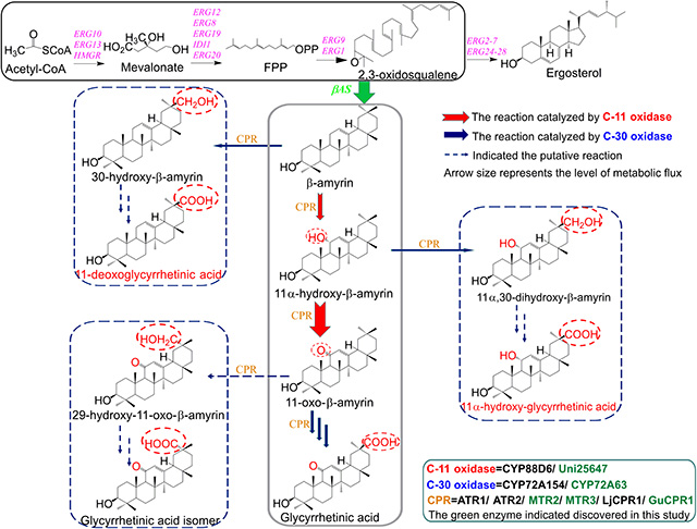 Terpenoids are wide spread in plant with potential application in pharmaceutical activity, such as anti-inflammatory, antibacterial and cancer treatment. Glycyrrhetinic acid as an important triterpenoid mainly extracted from licorice root, exhibiting specific activities in hepatoprotective and broad-spectrum virus inhibition. But the low content in licorice and inefficient extraction process have limited its wide application. To solve this problem, Li group developed a novel and highly efficient pathway for the synthesis of glycyrrhetinic acid and 11-oxo-β-amyrin in Saccharomyces cerevisiae by introducing efficient cytochrome P450s and pairing their reduction systems from legume plants through transcriptome and genome-wide screening and identification. The titer of glycyrrhetinic acid and 11-oxo-β-amyrin were further greatly improved through the fermentation process optimization. This study demonstrated the importance of pairing CYP450s and CPR for triterpenoids production. Moreover, this study is also helpful for constructing yeast cell factories for synthesizing other valuable triterpenoids.