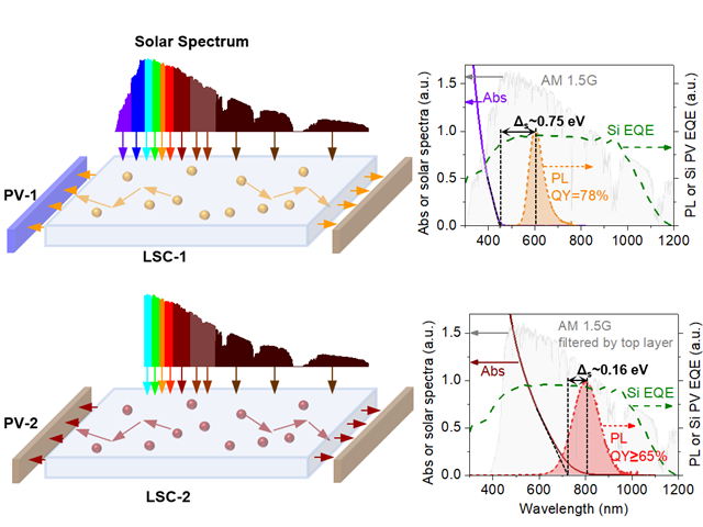 疊層式太陽能聚光器件工作原理示意圖,圖片來自Nature Photonics