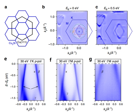 (a) 藍色表示CuSi2布里淵區,黑色表示Cu(111)表面布里淵區;(b)(c)ARPES測量費米面處和費米以下0.5eV處等能面圖; (e)(f)(g) ARPES測量沿著高對稱路徑的能譜密度圖