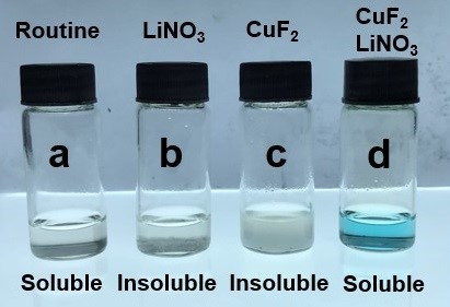 硝酸鋰(LiNO3)作為鋰硫電池電解液的添加劑,在抑制多硫化物的“穿梭效應”和保護金屬鋰負極上發揮了重要作用。鋰硫電池電解液體系多為醚類體系,而醚類體系因其窄的電化學窗口無法使用到高壓電池中(> 4.3 V),酯類電解液體系能夠承受4.3 V及以上電壓。黃佳琦研究員課題組通過引入微量的氟化銅(0.2wt %),最終實現了1.0 wt%硝酸鋰添加劑的溶解,整個溶液的顏色變化明顯:單獨的硝酸鋰和單獨的氟化銅試劑在酯類電解液中均無法溶解;當兩者共同加入溶液后,沉淀完全消失,并且呈現藍色。該藍色溶液的出現,是因為產生了可溶解的銅離子絡合物(圖1)。