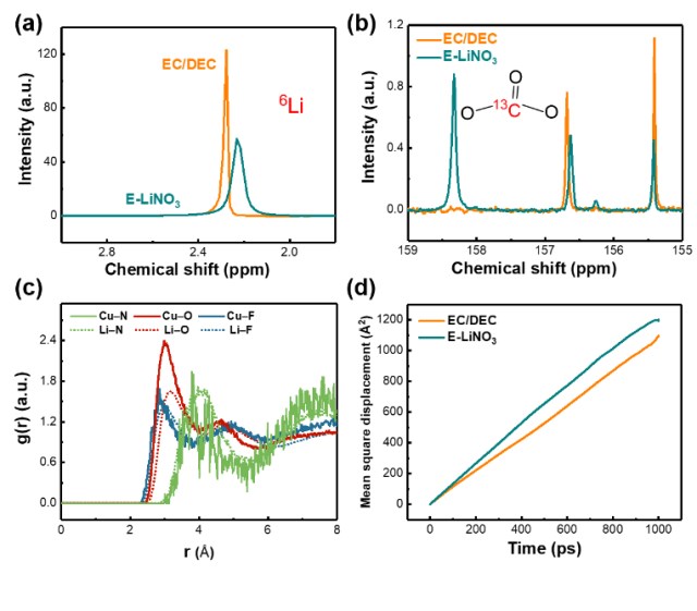 該工作通過核磁技術和分子動力學模擬對電解液的溶解機理和新型溶劑化結構進行了驗證,如圖2所示,藍色電解液中的13C的核磁信號相比于常規酯類電解液的核磁信號峰的數目發生了加倍,表面產生了新的陽離子配位中心。從6Li的核磁信號位移上看,銅離子的加入使得6Li的去屏蔽化變強,這一結果與計算結果相一致。