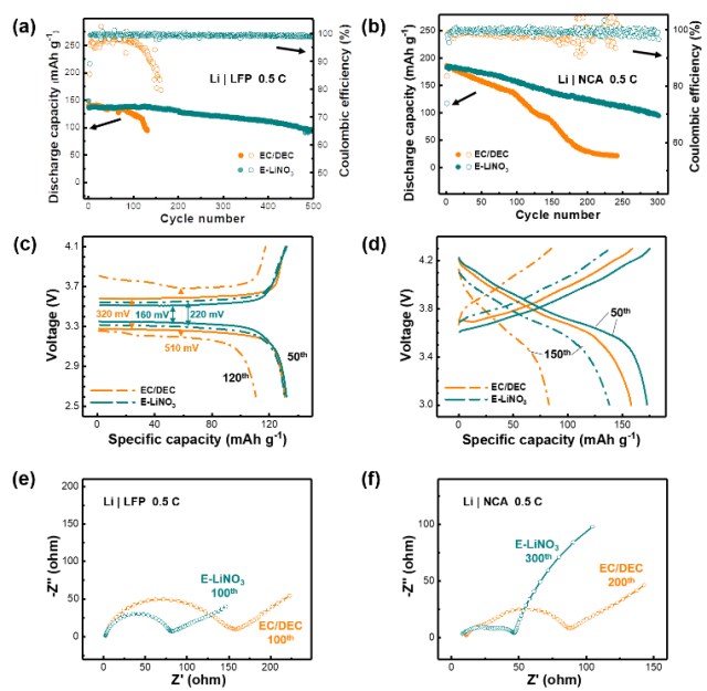 研究者在報道中指認了酯類條件下硝酸鋰的初始分解電位在1.4 V,并發現了其對鋰沉積形貌有明顯影響。含有硝酸鋰的藍色的電解液溶液被用于匹配以磷酸鐵鋰(LFP)和三元鎳鈷鋁(NCA)為正極,以金屬鋰(Li)為負極的電池體系中(圖3)。其中,磷酸鐵鋰電池在0.5C倍率下經過500次循環容量保持率維持在83%;高壓鎳鈷鋁電池在0.5C倍率下經過300次循環容量保持率在53%,均呈現出良好的電化學穩定性,新電解液體系下兩種類型電池的阻抗未發生明顯增大。