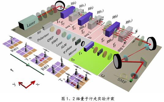 盡管拓撲保護束縛態的存在等一系列的拓撲現象首先在電子系統中被預言,越來越多的研究表明光學系統可以提供一個用于觀察拓撲現象的平臺。而基于光學系統所搭建的量子行走平臺表明,量子行走可以作為一種有效的量子模擬工具被用來研究受時間驅動系統的拓撲相。然而,現有的一些實驗研究僅局限于了一維量子行走。對于二維及更高維度的量子行走方案,由于缺乏對于量子行走中位置空間的有效操控,在量子行走系統中無法同時構造出表征有不同拓撲相的區域,因此對于存在于二維及更高維度的量子行走中的拓撲相關現象還沒有被實驗觀測到。