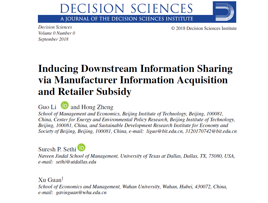 北京理工大學管理與經濟學院李果教授(第一作者),鄭鴻博士生等合作的研究成果《Inducing Downstream Information Sharing via Manufacturer Information Acquisition and Retailer Subsidy》于2018年10月1日在決策科學類國際頂級期刊《Decision Sciences》上在線發表。