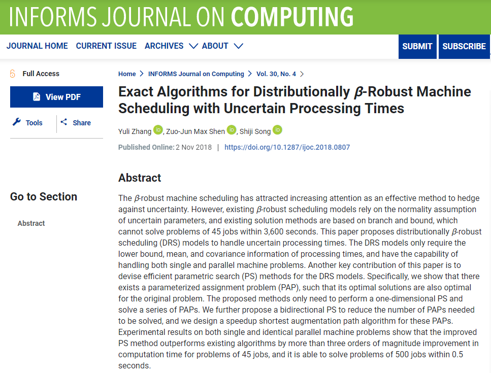 北理工管理與經濟學院教師張玉利與美國加州大學伯克利分校申作軍教授、清華大學宋士吉教授合作的研究成果“Exact Algorithms for Distributionally β-Robust Machine Scheduling with Uncertain Processing Times”近期在《INFORMS Journal on Computing》期刊發表。張玉利特別研究員為本文第一作者。