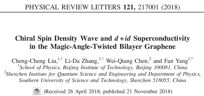 2018年11月21日,北京理工大學物理學院由楊帆教授牽頭,劉鋮鋮研究員、張力達副教授合作在物理學最頂級的權威期刊《Physical Review Letters》(IF="8.839)上發表了題為《Chiral" Spin Density Wave and d+id Superconductivity in the Magic-Angle-Twisted Bilayer Graphene》的研究論文。這篇論文對于今年新發現的魔角雙層石墨烯中的非常規高溫超導現象提出一種新的理論機制,獲得國際學術界的廣泛認同和跟進,成為目前該研究領域的重要理論之一(在Google Scholar上已被引用21次)。