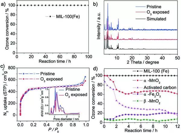 (a)MIL-100(Fe)的臭氧轉(zhuǎn)化率。b)模擬的、合成的和暴露于臭氧的MIL-100(Fe)的粉末XRD圖案。c)在暴露于臭氧之前和之后,MIL-100(Fe)的N2吸附等溫線。插圖:MIL-100(Fe)的孔徑分布。d)分別對MIL-100(Fe)、α-MnO2、活性炭、α-Fe2O3和β-MnO2進(jìn)行臭氧轉(zhuǎn)化。條件:用0.27g石英砂稀釋的0.03g催化劑, C( O3)= 45ppm,流速="1000mL" min-1,RH="45%,室溫。)