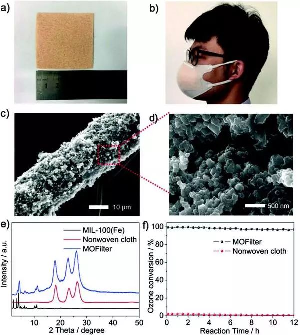 (a,b)MOFilter的照片和包含MOFilter的口罩。c)MOFilter的SEM圖像。d)(c)中方框的放大圖像。e)模擬MIL-100(Fe),無紡布和MOFilter的XRD圖案。f)MOFilter上的臭氧去除,入口臭氧濃度為200ppb,室溫下RH為45%。)