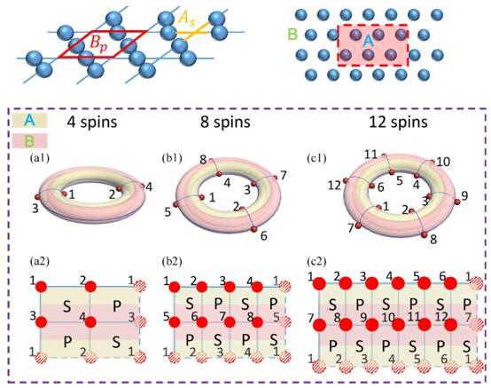 日前,課題組建議一種實驗方案:基于最小熵態(minimum entropy states)研究拓撲糾纏熵。最小熵態是可用于觀察拓撲序的一種多qubit糾纏態(如圖2所示)。通常的做法應該是:在量子多體系統構建多粒子糾纏態(量子最小熵態),然后基于純量子信息處理平臺進行實驗研究。然而,按這種方式執行,實現起來是非常困難的。原因是要想觀察到拓撲糾纏熵需要多粒子糾纏態的fidelity至少達到90%以上,而目前在IBM量子計算機平臺上構建的12-qubit糾纏態fidelity少于44%。
