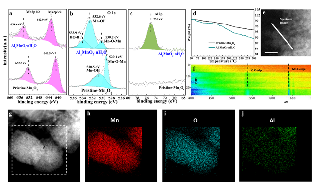 該研究團隊設計了一種原位轉化電化學反應來使得尖晶石型Mn3O4轉化為含水的層狀、無定形混合相AlxMnO2·nH2O的目的。為了驗證該方法的可行性,采用電子能量損失法(EELS),X射線光電子分析以及透射電子顯微鏡-能量色散X射線光譜對反應產物的化學狀態和元素種類進行了分析與表征。通過分析,電化學轉化反應后Mn元素由2價/3價轉化為4價。熱重分析表明反應產物在50~300℃表現出更明顯的質量下降趨勢,表明在轉化反應過程中結晶水的損失(圖1)。通過以上一系列表征分析進一步證明了Mn3O4→AlxMnO2·nH2O原位轉化反應的發生。