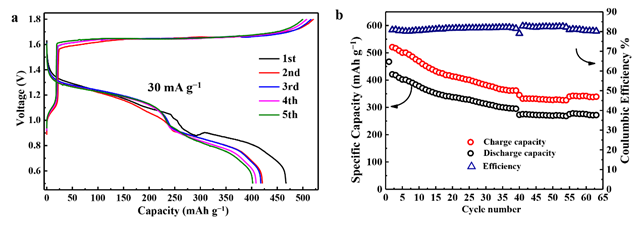 以AlxMnO2·nH2O為正極,金屬鋁片為負極,Al(OTF)3-H2O為電解液裝配水系鋁離子電池,發現AlxMnO2·nH2O在1.3V和1.65V分別呈現短的充電平臺和長的充電平臺,對應于鋁離子的脫出反應。首周放電容量高達467mAh g-1加之較高的放電平臺電壓(平均值達到1.1V)使得該電極材料的能量密度高達481Wh kg-1,在目前的相關研究報道中處于領先。