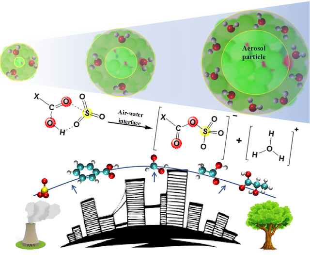 在此基礎上,兩團隊還進一步開展合作,對上述重要污染物SO3與大氣中含量豐富的有機酸在水滴表面通過非均相化學反應形成氣溶膠顆粒物的機制進行了研究(圖2)。發現氣液界面處,有機酸分子不僅可以作為SO3與H2O反應的催化劑,而且還可與SO3在皮秒時間內直接反應生成類似表面活性劑的離子,從而協助水滴進一步吸收大氣中的凝結性物質并促進顆粒物迅速增長。該研究闡明了高度污染地區顆粒物爆發性增長的新的增長機制。