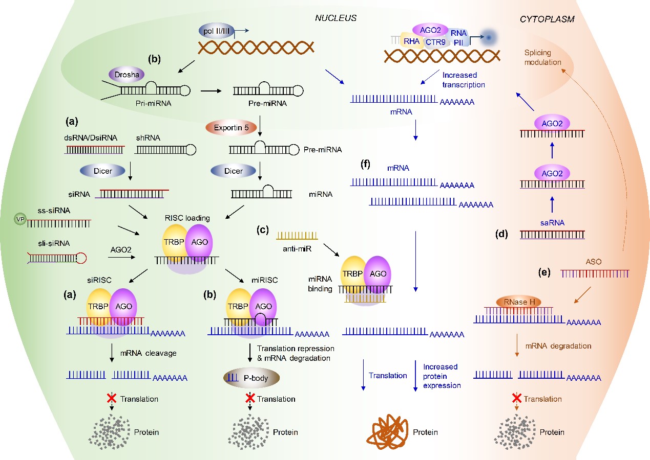 (a)小干擾RNA(siRNA)與(b)微小RNA(miRNA)的作用通路;(c)miRNA拮抗核酸作用機制;(d)小激活RNA(saRNA)的工作模式;(e)反義核酸(ASO)作用方式;(f)信使RNA(mRNA)療法的特點