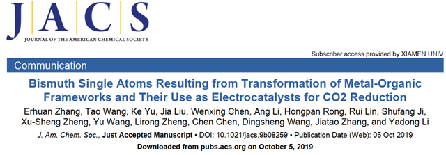 近日,北京理工大學(xué)材料學(xué)院張加濤課題組將無(wú)機(jī)納米界面合成化學(xué)推進(jìn)到單原子精度,與清華大學(xué)李亞棟院士、王定勝副教授團(tuán)隊(duì)合作,在Bi單原子催化劑精準(zhǔn)制備及電催化CO2還原性能研究方面取得突破性進(jìn)展,以“Bismuth Single Atoms Resulting from Transformation of Metal-Organic Frameworks and Their Use as Electrocatalysts for CO2 Reduction”為題,于10月5日在材料、化學(xué)領(lǐng)域的頂級(jí)期刊《Journal of the American Chemical Society》上在線發(fā)表, 2019, 10.1021/jacs.9b08259 (https://pubs.acs.org/doi/10.1021/jacs.9b08259)。