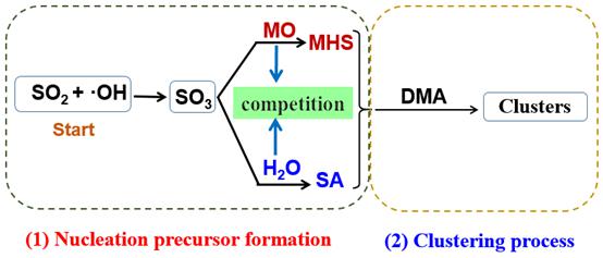 圖1 成核前驅(qū)體(硫酸(SA)和硫酸甲酯(MHS))的競爭生成過程及其后續(xù)形成團(tuán)簇的過程。甲醇:MO,二甲胺:DMA。