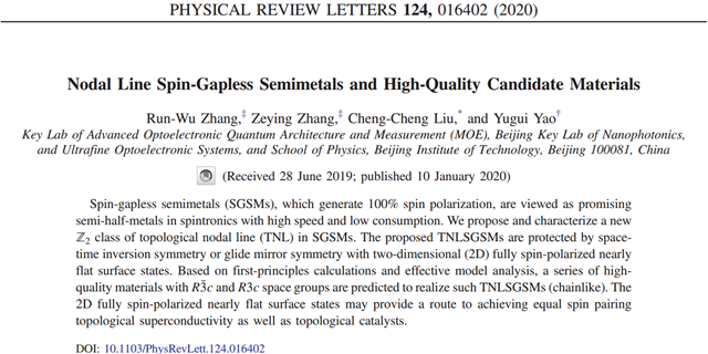 該工作發(fā)表于物理學(xué)頂級(jí)期刊《Physical Review Letters》: Run-Wu Zhang, Zeying Zhang, Cheng-Cheng Liu, and Yugui Yao; “Nodal Line Spin-gapless Semimetals and High-quality Candidate Materials”, Physical Review Letters, 124, 016402 (2020).