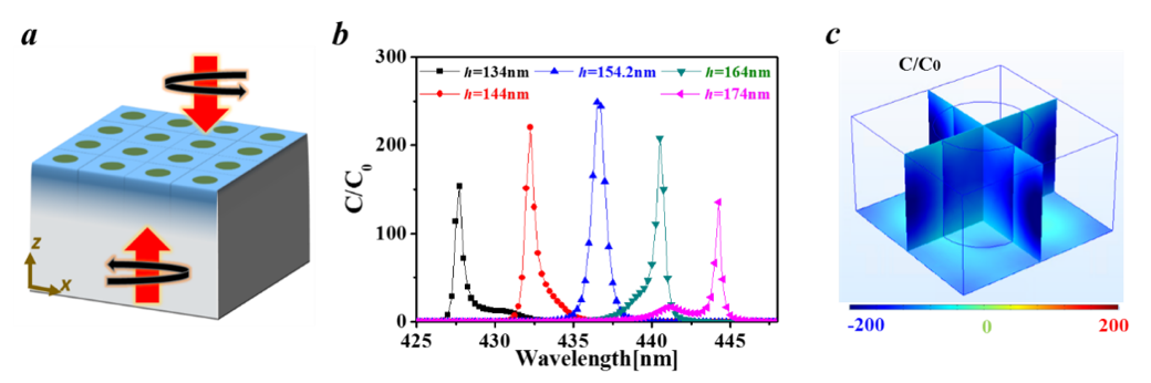 研究顯示:基于微納結構增強光與分子之間的手性相互作用,進而實現表面增強的分子手性探測是非常有前景的發展方向。為了實現最優的全光手性探測平臺,所設計的微納結構需要滿足以下三個要求:1. 可以產生強且空間均勻分布的具有手征特性的光場,稱其為超手征光場(Superchiral fields);2. 微納結構本身不具有手性以避免其掩蓋分手的手性信號;3. 微納結構的光學損耗應盡可能的小,以避免熱效應對分子構型的影響。同時滿足這三方面的要求并不容易,因此,目前人們還沒有設計出理想的微納結構來實現高效的表面增強的分子手性探測方案。