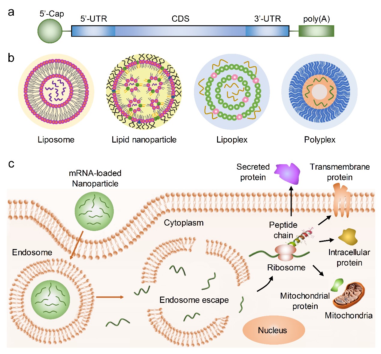 圖1 mRNA療法示意圖。(a)體外轉錄mRNA的結構;(b)mRNA遞送載體示意圖;(c)mRNA入胞表達目的蛋白示意圖