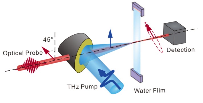 近日,北京理工大學(xué)光電學(xué)院趙躍進(jìn)教授課題組同首都師范大學(xué)張亮亮研究員課題組合作,在太赫茲波探測(cè)液態(tài)水中氫鍵運(yùn)動(dòng)研究方面取得新進(jìn)展。他們發(fā)現(xiàn)在自由下落的水膜上施加超強(qiáng)的寬帶太赫茲脈沖會(huì)引起折射率的可測(cè)量變化,這與液態(tài)水中共振激發(fā)的氫鍵振動(dòng)有關(guān)。該研究實(shí)現(xiàn)了在亞皮秒時(shí)間分辨率下對(duì)液態(tài)水中超快的氫鍵動(dòng)力學(xué)演化過程的觀察。該研究成果以"Ultrafast Hydrogen-Bond Dynamics of Liquid Water revealed by Terahertz-induced Transient Birefringence" 為題在線發(fā)表在國(guó)際光學(xué)頂尖期刊Light: Science & Applications上。