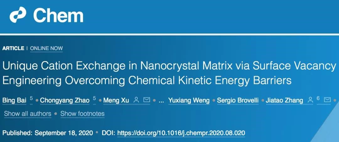 可控?fù)诫s引起的精準(zhǔn)能帶工程是光電新能源應(yīng)用的半導(dǎo)體納米材料關(guān)鍵前提。近日,北京理工大學(xué)張加濤教授團(tuán)隊(duì)利用表面空位成功克服離子交換反應(yīng)當(dāng)中的動(dòng)力學(xué)勢(shì)壘,創(chuàng)新性提出了新的合成方法,在制備雙異價(jià)離子摻雜半導(dǎo)體納米晶/量子點(diǎn)的研究中取得重要進(jìn)展,相關(guān)成果以“Unique Cation Exchange in Nanocrystal Matrix via Surface Vacancy Engineering Overcoming Chemical Kinetic Energy Barriers” 為題,于Cell旗艦雜志《Chem》在線(xiàn)發(fā)表(IF:19.735)(文章DOI: 10.1016/j.chempr.2020.08.020)。