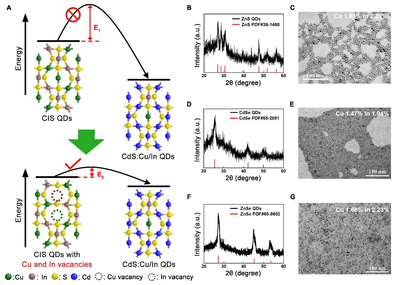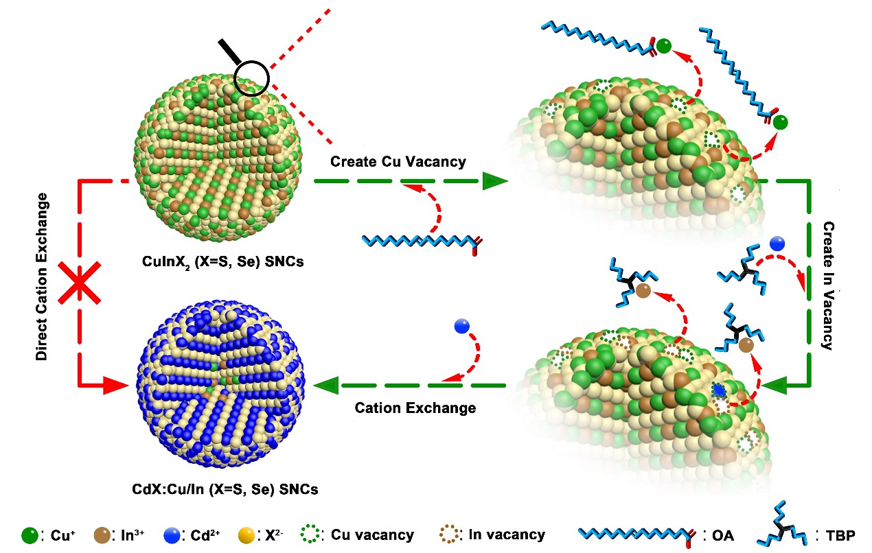 有目的地向納米晶當(dāng)中摻入異價(jià)雜質(zhì),可以引入額外的中間能級(jí)、電子/空穴,從而有效調(diào)控納米晶的光學(xué)、電學(xué)和磁學(xué)等性質(zhì)。受自清潔效應(yīng)的影響,獲得穩(wěn)定且高效的摻雜納米晶較為困難,尤其是在多元體系實(shí)現(xiàn)可控雙摻雜。張加濤課題組以CuInX2(X="S," Se)納米晶為起始材料,開(kāi)發(fā)了一種表面空位工程誘導(dǎo)的離子交換法,通過(guò)在表面精準(zhǔn)的創(chuàng)造Cu空位和In空位,極大地降低了反應(yīng)的動(dòng)力學(xué)勢(shì)壘,使動(dòng)力學(xué)上很難實(shí)現(xiàn)的反應(yīng)很容易實(shí)現(xiàn),成功制備了Cu、In雙摻雜的CdX和ZnX納米晶/量子點(diǎn)。該方法具有一定的普適性,可實(shí)現(xiàn)更多的硫?qū)侔雽?dǎo)體納米晶材料的精準(zhǔn)組分、摻雜調(diào)控。