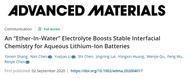 文獻(xiàn)鏈接:An “Ether-In-Water” Electrolyte Boosts Stable Interfacial Chemistry for Aqueous Lithium-Ion Batteries. Adv. Mater. , 2020, DOI:10.1002/adma.202004017。
