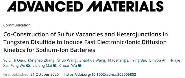 近日,北京理工大學(xué)材料學(xué)院吳鋒院士團(tuán)隊(duì)在鈉離子電池材料的結(jié)構(gòu)設(shè)計(jì)和性能優(yōu)化方面取得重要突破。材料類國際頂級期刊《Advanced Materials》(《先進(jìn)材料》,影響因子27.398)以“Co-Construction of Sulfur Vacancies and Heterojunctions in Tungsten Disulfide to Induce Fast Electronic/Ionic Diffusion Kinetics for Sodium-Ion Batteries”為題在線報道了這一研究進(jìn)展。該工作由吳鋒院士團(tuán)隊(duì)的吳川教授課題組完成,北京理工大學(xué)材料學(xué)院博士后李雨為第一作者,北京理工大學(xué)吳鋒院士、吳川教授和武漢理工大學(xué)麥立強(qiáng)教授為共同通訊作者(文獻(xiàn)鏈接:https://onlinelibrary.wiley.com/doi/10.1002/adma.202005802)。