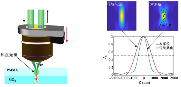 (a) 斜向激發與收集光路   (b) 壓縮了散射體軸向尺寸
