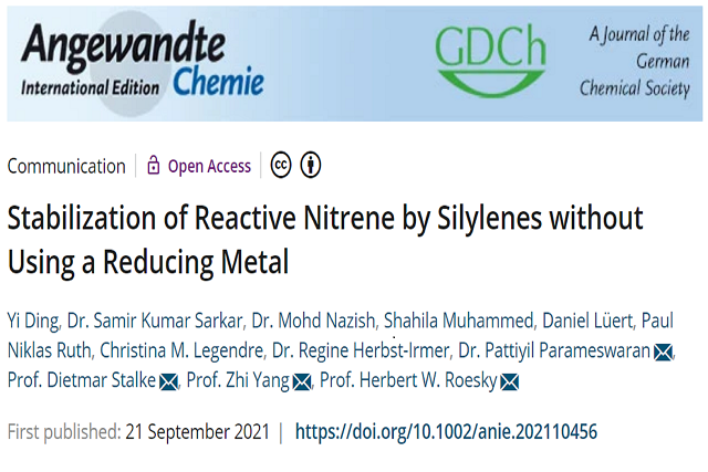 近日,北京理工大學化學與化工學院楊智教授與合作者在氮卡賓領域取得重要進展。相關成果以“Stabilization of Reactive Nitrene by Silylenes without using a Reducing Metal”為題,在國際化學頂級期刊《Angewandte Chemie International Edition》發表,被期刊列為Hot Paper。北京理工大學化學與化工學院博士丁毅為第一作者,北京理工大學楊智教授、哥廷根大學Herbert W. Roesky教授、哥廷根大學Dietmar Stalke教授和卡利卡特國立理工學院Pattiyil Parameswaran博士為共同通訊作者。