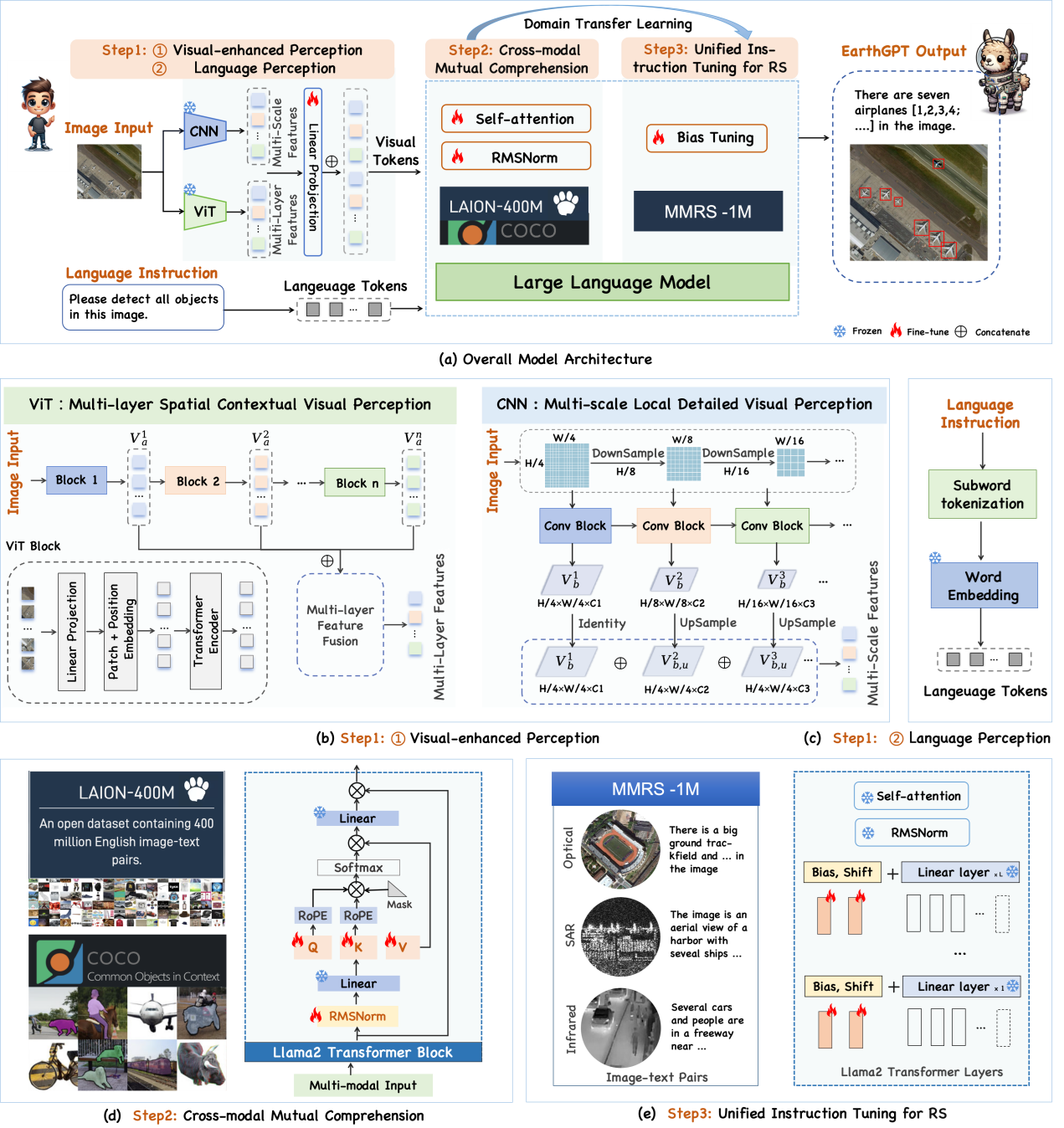遙感通才模型EarthGPT包括三項(xiàng)關(guān)鍵技術(shù):(1)視覺(jué)增強(qiáng)感知機(jī)制,通過(guò)混合專家編碼器提煉視覺(jué)粗粒度語(yǔ)義信息和細(xì)粒度感知信息。(2)跨模態(tài)交互理解方法,基于大規(guī)模自然圖像數(shù)據(jù)集做預(yù)訓(xùn)練,賦予大語(yǔ)言模型基本的圖像理解能力和多輪對(duì)話能力。(3)統(tǒng)一指令微調(diào)方法,在本文構(gòu)建的遙感多模態(tài)指令數(shù)據(jù)集MMRS-1M(含100萬(wàn)圖像-文本對(duì))上做微調(diào),實(shí)現(xiàn)遙感場(chǎng)景下的綜合圖像解譯能力(圖2)。