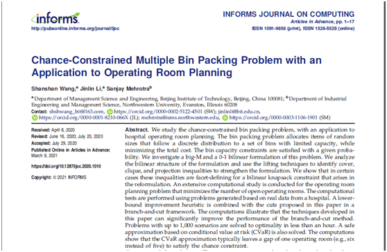 日前,北理工管理與經(jīng)濟(jì)學(xué)院李金林教授及其博士研究生王珊珊與美國西北大學(xué)工業(yè)工程與管理科學(xué)系Sanjay Mehrotra教授合作的研究成果“Chance-Constrained Multiple Bin Packing Problem with an Application to Operating Room Planning”近期在《INFORMS Journal on Computing》期刊在線發(fā)表。該項成果是在國家自然科學(xué)基金重點項目(71432002)支持下完成的。