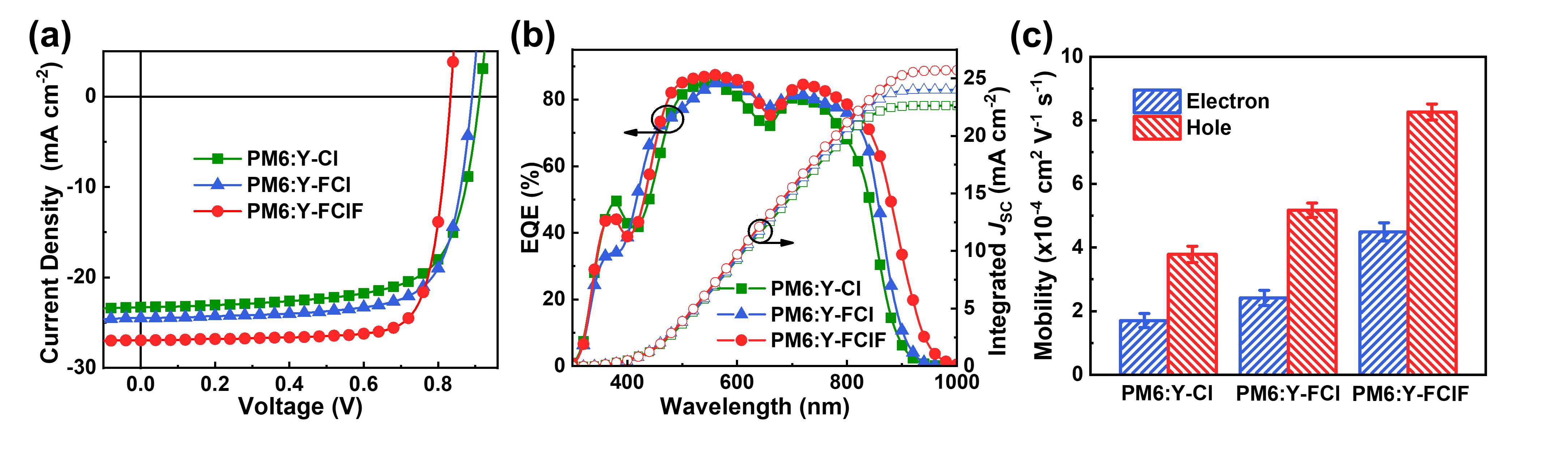 圖3. (a)太陽能電池的 J-V 曲線;(b)EQE外量子效率圖;(c)載流子遷移率柱狀圖。