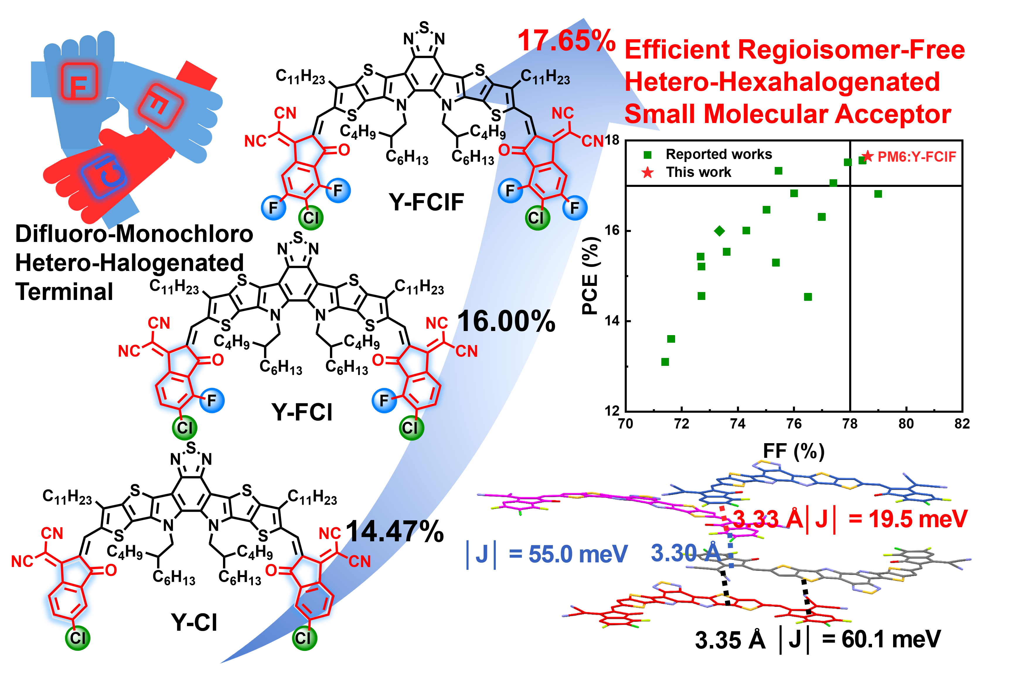 隨著“雙碳”目標的提出,一場對于能源的革命勢在必行。有機太陽能電池(OSCs)作為一種清潔能源技術,由于具有輕、薄、柔和易加工等諸多優點受到了廣泛關注。得益于高效聚合物給體材料和新型非富勒烯受體材料的發展,有機太陽能電池光電轉換效率取得重要突破。為了實現OSCs的商業化目標,開發性能更加優異的小分子受體材料(SMAs)并且深入探究其分子堆積和器件性能之間的關系十分有必要。A-DA’D-A型SMAs是目前OSCs領域研究非常熱門一類高效受體材料,眾多圍繞該類材料的結構優化推動了OSCs效率的進一步提高。核心工程、側鏈工程以及端基工程是調節分子堆積和提高光伏性能比較常用的手段,其中端基工程受限于有限的可修飾位點和較高的合成難度受到的關注相對較少。改變鹵素原子數目或鹵化位置是調節分子能級和給受體共混膜形貌從而獲得顯著的器件性能的最常用策略之一。此外,在端基上引入不同種類的鹵素原子可能會導致SMAs光伏器件性能的巨大差異。然而目前市面上同鹵素端基的種類有限,因此在同一個端基上引入多種鹵素的雜鹵代SMAs顯然有待開發和研究。同時,如何通過新穎的雜鹵化端基和單晶分子堆積模式來調控分子性質和聚集形態特征和理解其與器件性能之間的關系,實現高效率受體材料的創制,也是目前有機太陽能電池領域的關鍵科學問題之一。
