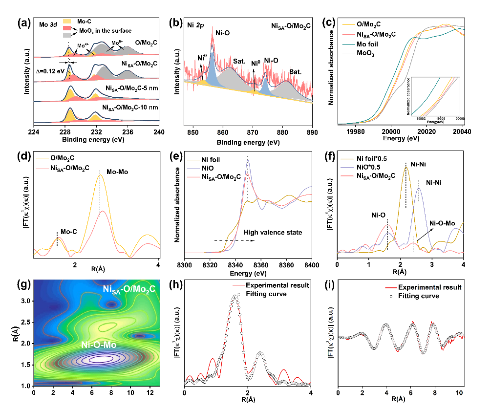 通過對O/Mo2C、NiSA-O/Mo2C表面以及不同刻蝕深度的XPS結果進行分析,Mo2C表面的氧化程度是規律且可控的。同時使用同步輻射進一步分析、擬合了Ni單原子在Mo2C表面的配位環境,證實了Ni-O-Mo配位鍵的合理性。