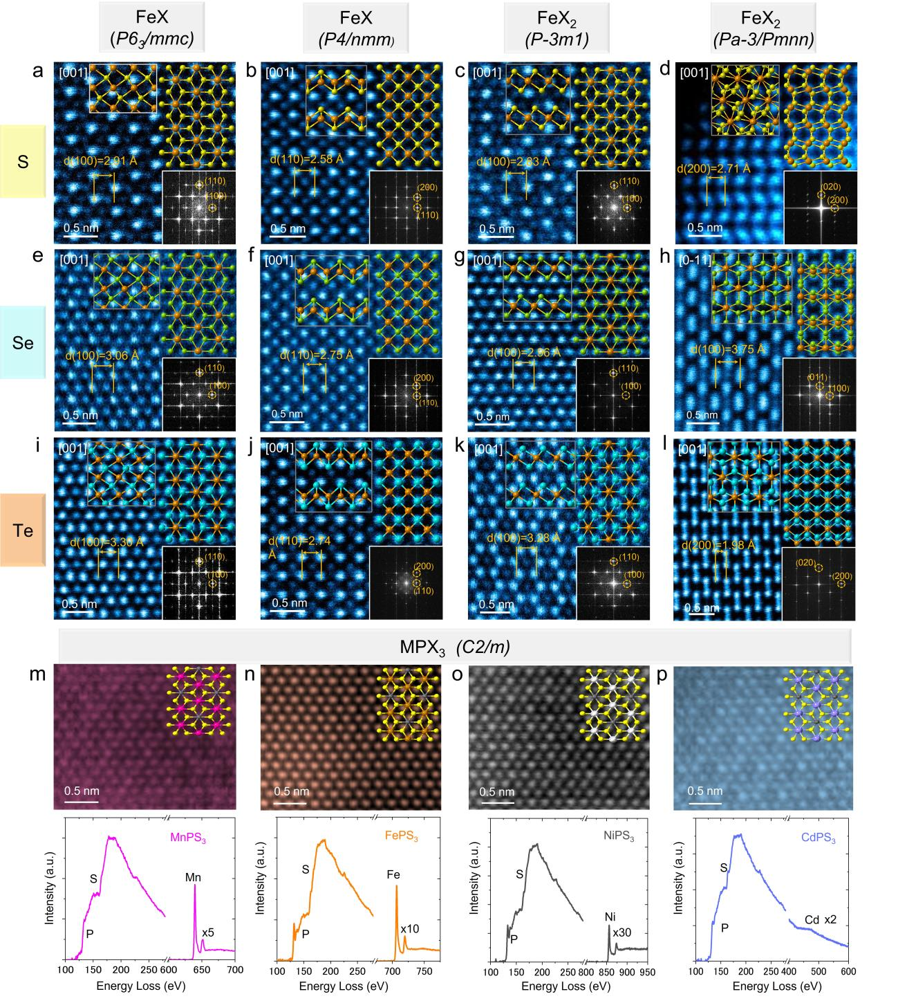 根據(jù)實(shí)驗(yàn)和模擬Z-contrast STEM圖像、EDS mapping和EELS結(jié)果綜合分析,制備所得的大部分鐵基硫族化合物和TMPCs屬于5個(gè)不同的空間點(diǎn)群,可劃分為5類:(1)P63/ mmc (非層狀六方/三角形FeX);(2) P4/ nmm (層狀四方FeX);(3) P3 ?m1(六邊形/三角形/梯形的層狀FeX2);(4) Pa3 ?(非層狀FeS2納米線)和Pmnn(非層狀FeS2和FeTe2納米線);(5) C2/m (MPX3, M = Mg, V, Cr, Mn, Fe, Co, Ni, Ag, Cd或Zn)。以MPX3為例,從結(jié)構(gòu)上看,單層MPX3的元胞由一個(gè)啞鈴狀P2X6和兩個(gè)M原子組成,形成每個(gè)M原子與6個(gè)X原子配位,每個(gè)P原子與1個(gè)P和3個(gè)X原子配位的蜂窩狀結(jié)構(gòu)。當(dāng)沿垂直方向堆疊時(shí),MPX3層之間的面間位移打破了三重反轉(zhuǎn)旋轉(zhuǎn)對(duì)稱性,產(chǎn)生了一個(gè)屬于C2/m空間群的單斜晶格。STEM-ADF圖像沿[103]帶軸呈現(xiàn)六重對(duì)稱晶格,與多層MPX3的六方單層和單斜堆疊特征一致。此外,通過(guò)相應(yīng)樣品Mn L2,3邊,F(xiàn)e L2,3邊,Ni L2,3邊和Cd M4,5邊的EELS光譜確定了MPX3的元素組成。