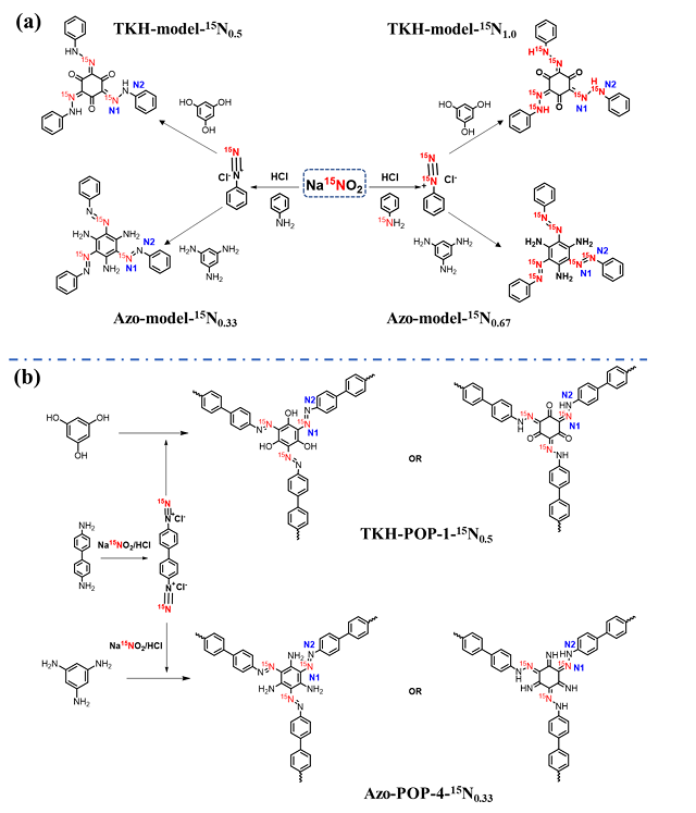 然而,在固態下是否也存在這種三 (β-酮-腙)環己烷的結構,還沒有得到科學界的證實。本工作中,該課題組首先以15N標記的亞硝酸鈉作為便宜易得的15N源,實現了一半15N 標記(TKH-model-15N0.5)、全15N標記(TKH-model-15N1.0)的模型化合物、以及一半15N 標記的多孔高分子(TKH-POP-1-15N0.5)。作為對比,他們同時制備了1,3,5-三氨基苯與相應的重氮鹽偶聯產物(Azo-model-15N0.33、Azo-model-15N0.67和Azo-POP-4-15N0.33),發現仍然以偶氮鍵形式存在。