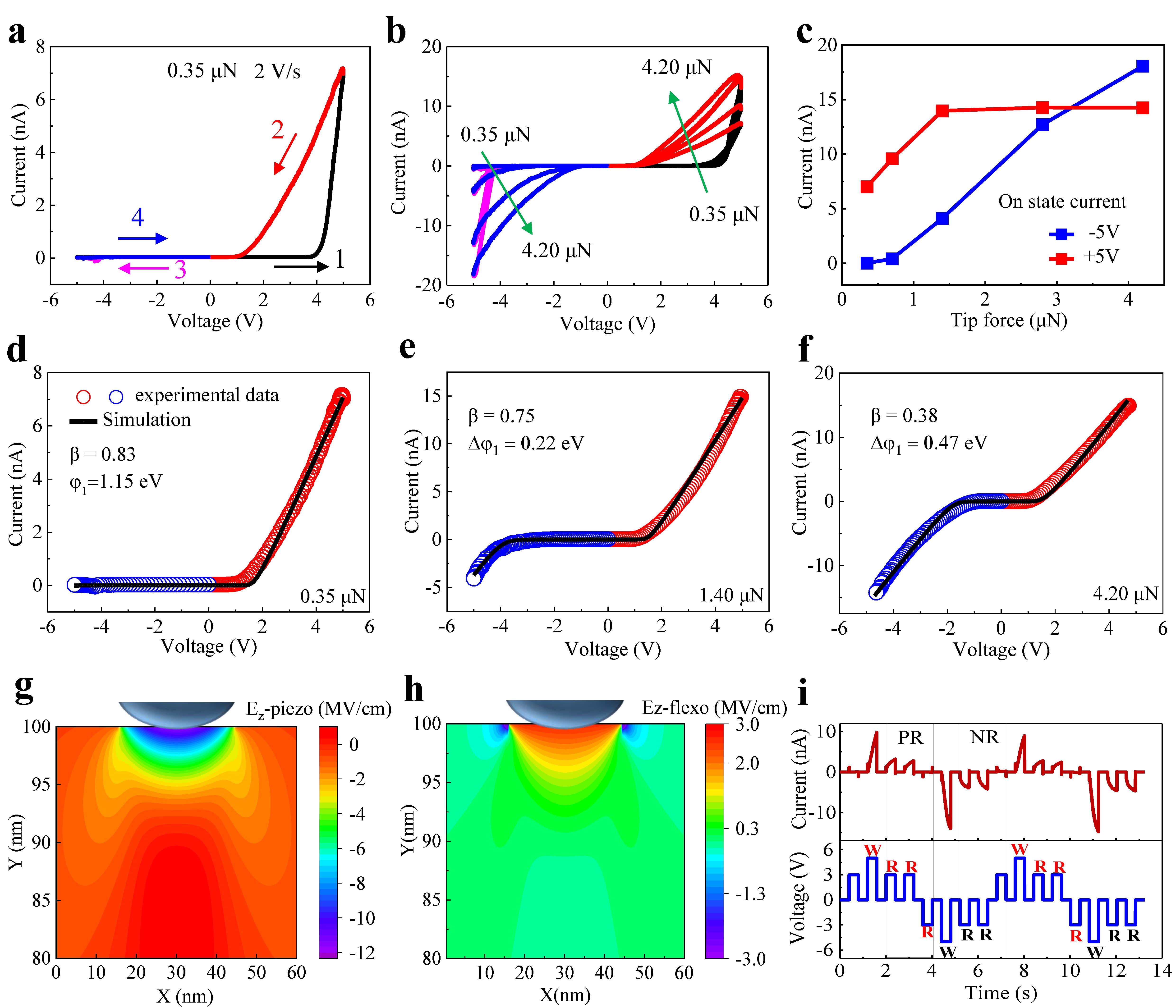 近年來,能感知外界復雜環境刺激的離子型憶阻器是神經網絡學習領域的重要研究方向。其中的自整流性質須通過復雜的微納加工/集成來實現,因此容易出現結構不兼容、整流方向不能靈活調控、無法應用于雙向(正反電壓)操作模式等問題。因此,迫切需要探索自身具有本征離子活性、電流整流方向靈活可調的單相離子型憶阻材料和調控方式。在此研究背景下,王學云與洪家旺課題組報道了在一種單相離子型憶阻材料CuInP2S6 (CIPS)中整流效應的力學與電學調制方式。通過原子力掃描探針技術在CIPS材料中觀測到顯著的Cu+離子遷移以及離子誘導的可調控自整流效應(如圖1所示),并且通過改變掃描電壓大小、速率、方向等方式,在Cu+離子的可控遷移和界面肖特基勢壘的協同貢獻下,實現了電流整流行為的連續調控。在此基礎上,通過納米探針施加局部的機械應變和應變梯度,誘導壓電電場和撓曲電場調控界面肖特基勢壘,進而實現了電流整流行為的力學連續可調(如圖2所示)。該工作展示了范德瓦爾斯材料具有的電場和應變場調控的自整流特性,使該材料對外界動態復雜環境變化具有靈敏的識別能力,是未來智能憶阻器和神經網絡學習的理想候選材料。