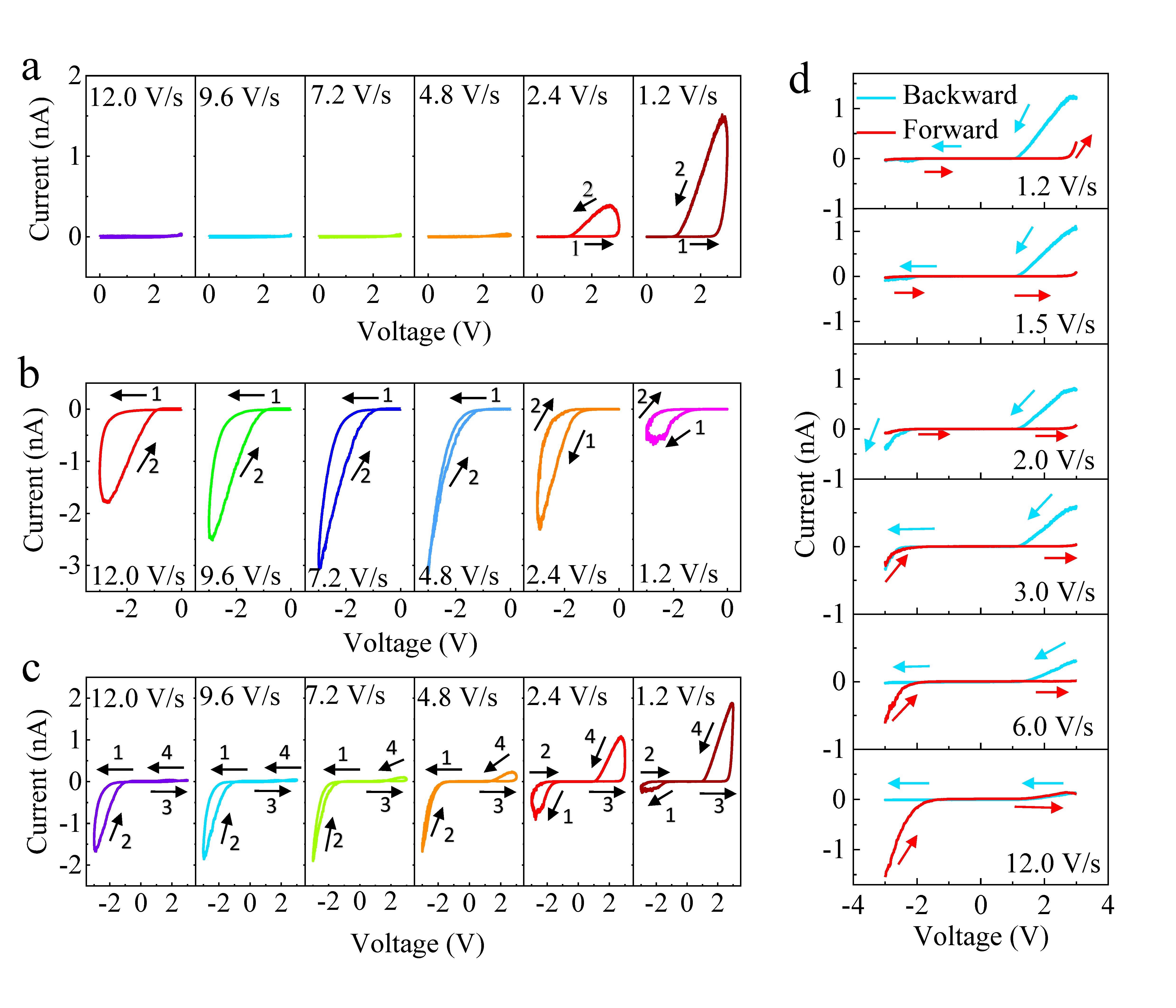 圖1 掃描速率和掃描方向調控的電流整流行為