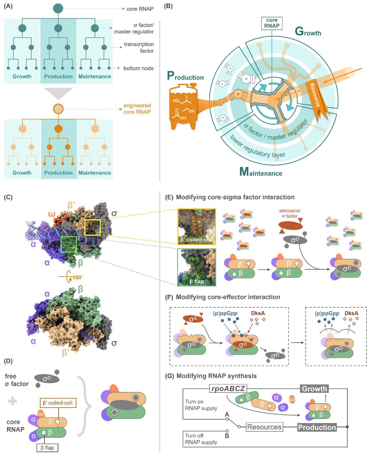 RNAP核心酶類似于一個多通閥,負責控制資源向增長、維護和生產三個模塊的分配。為了構建具有魯棒性的微生物細胞工廠,可以自上而下地對基因調控網絡進行改造,從最上層的RNAP核心酶到σ因子和全局轉錄因子,再到更下層的功能基因,以實現細胞資源的整體重分配和局部精準引導(圖1B)。綜述通過分析RNAP核心酶結構的最新研究進展(圖1C),針對核心酶與σ因子結合的兩個主要區域(β'亞基的coiled-coil結構域和β亞基的flap結構域)(圖1D),論述了三種調節全酶中的σ因子分布的不同策略,包括改變RNAP核心酶上與σ因子的相互作用的關鍵區域(圖1E)、改變RNAP核心酶與效應因子之間的相互作用(圖1F)、控制RNAP 核心酶的合成以實現資源分配在生長(A通路)和生產(B通路)之間的切換(圖1G),從而最終可以通過工程式改造RNAP核心酶(斜線填充)實現全局轉錄調控網絡的重編程,加強與生產相關模塊(深橙色)的表達(圖1A)。