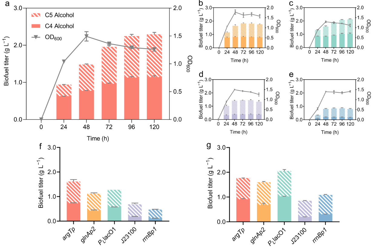 本文第一作者馬曉焉副研究員和博士研究生馬煉杰聚焦利用轉錄調控手段提升細胞工廠魯棒性的研究,取得了一系列的研究進展。在全局調控層面,建立了σ54型RNA聚合酶驅動的合成途徑持續表達系統,解決了σ70型全酶在生長穩定期和脅迫條件下的供應不足問題,實現了合成途徑的自響應、自激活和自強化,對低pH、高滲透壓等脅迫條件表現出較好的抵御能力,成功實現了跨越整個生長期和脅迫條件下的高效生物合成。以σ54依賴型啟動子驅動高級醇的生物合成,高級醇產能在進入菌體生長穩定期后持續加強,產量達到常用σ70依賴型啟動子的3倍( Biotechnol Biofuels . 2020, 13:29)。