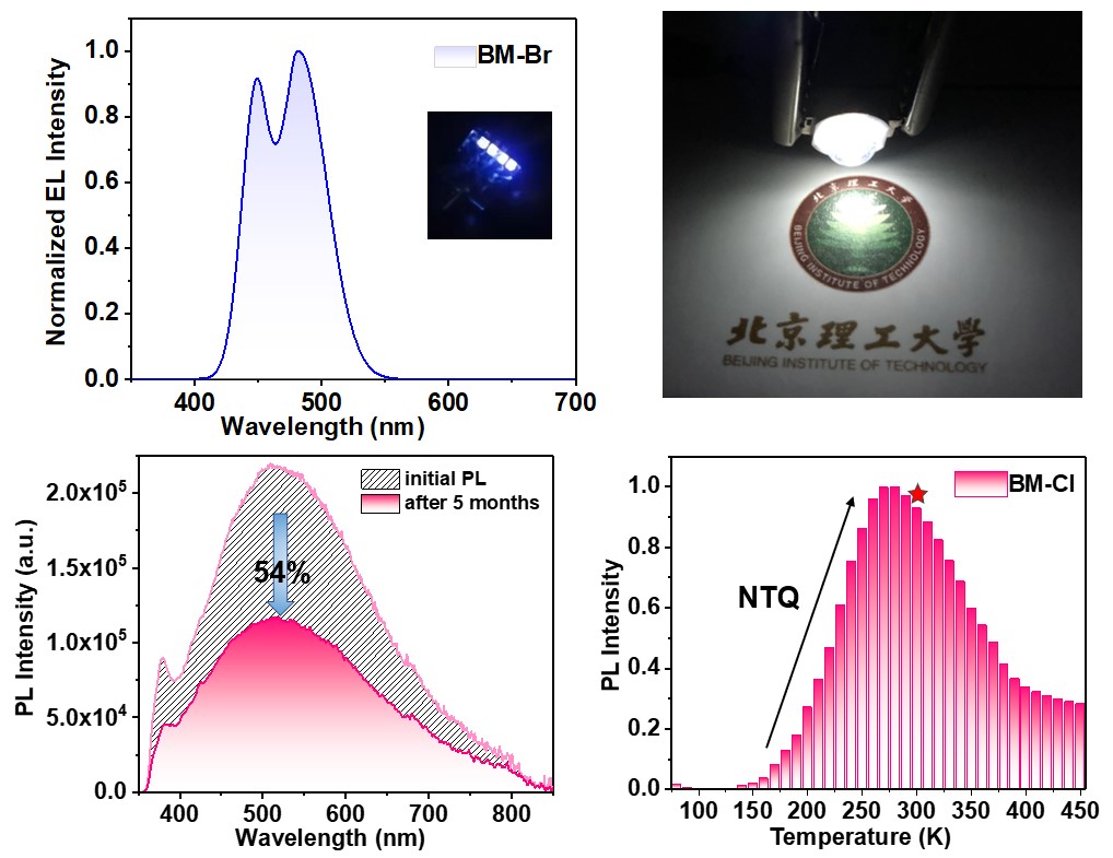 最后,該團(tuán)隊(duì)將兩種二維鈣鈦礦單晶材料分別應(yīng)用于電致發(fā)光二極管(LED)和光致發(fā)光器件。基于BM-Br發(fā)光層的LED器件發(fā)出明亮的深藍(lán)光,其CIE顏色坐標(biāo)為(0.159, 0.097),很好的對應(yīng)了顯示器深藍(lán)指數(shù)的標(biāo)準(zhǔn)坐標(biāo);將BM-Cl熒光粉應(yīng)用于光致發(fā)光器件,可發(fā)出明亮的寬帶白光。此外,BM-Cl熒光粉還表現(xiàn)出一個(gè)負(fù)熱猝滅(NTQ)范圍,并且在室溫300 K左右達(dá)到最大強(qiáng)度,在450 K之前熱猝滅較弱。基于BM-Br發(fā)光層的深藍(lán)光LED和基于BM-Cl的白光熒光粉都表現(xiàn)出優(yōu)異的穩(wěn)定性(圖3),在顯示照明領(lǐng)域有較大的應(yīng)用潛力。