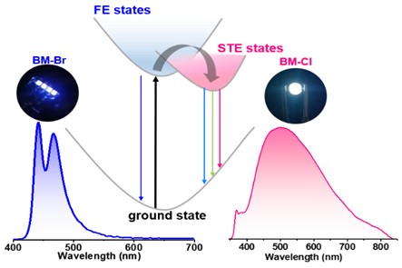 近年來,低維有機(jī)-無機(jī)雜化金屬鹵素鈣鈦礦開辟了單一組分白光熒光粉的新領(lǐng)域,研究表明其寬帶白光發(fā)射是由自陷激子(self-trapped excitons, STEs)回到基態(tài)產(chǎn)生的,并依賴于影響材料電子-聲子耦合強(qiáng)度的晶格扭曲程度和無機(jī)骨架與有機(jī)陽離子之間的相互作用。以往報(bào)道發(fā)現(xiàn)鹵素取代可調(diào)控出低維鈣鈦礦晶體的STE寬峰白光發(fā)射,但其內(nèi)在機(jī)制尚未清楚。該團(tuán)隊(duì)為了探究不同鹵素對2D鈣鈦礦STE自陷態(tài)發(fā)光機(jī)制的影響,將質(zhì)子化的苯并咪唑作為有機(jī)陽離子,分別以Br-和Cl-為鹵素陰離子合成了兩個(gè)100取向的二維鈣鈦礦單晶BM-Cl和 BM-Br。值得注意的是,雖然二者具有相似的晶體結(jié)構(gòu),并且晶體在無機(jī)八面體框架中幾乎無扭曲,但是卻展示出完全不同的發(fā)光特征和機(jī)制(圖 1)。
