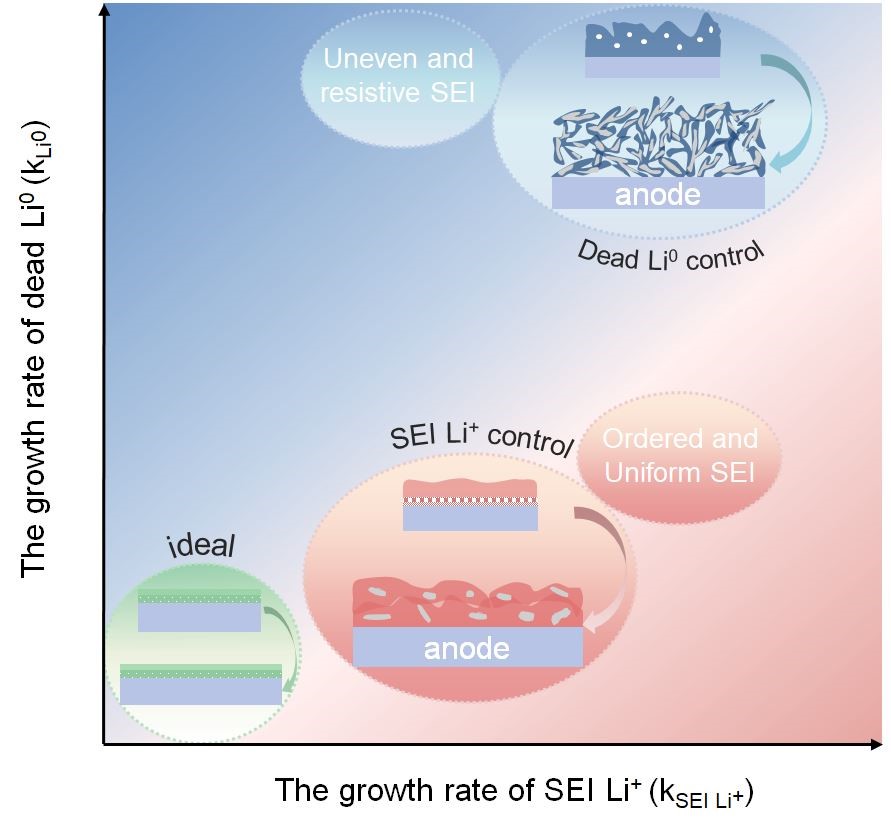 圖3 不同的SEI Li+和dead Li0增長(zhǎng)速率(kSEI Li+, kLi0)與金屬鋰負(fù)極的界面演化相關(guān)性的示意圖。藍(lán)色區(qū)域的非活性鋰為死鋰控制,其中kLi0/kSEI Li+>1;紅色區(qū)域的非活性鋰為SEI Li+控制,其中kLi0/kSEI Li+<1。