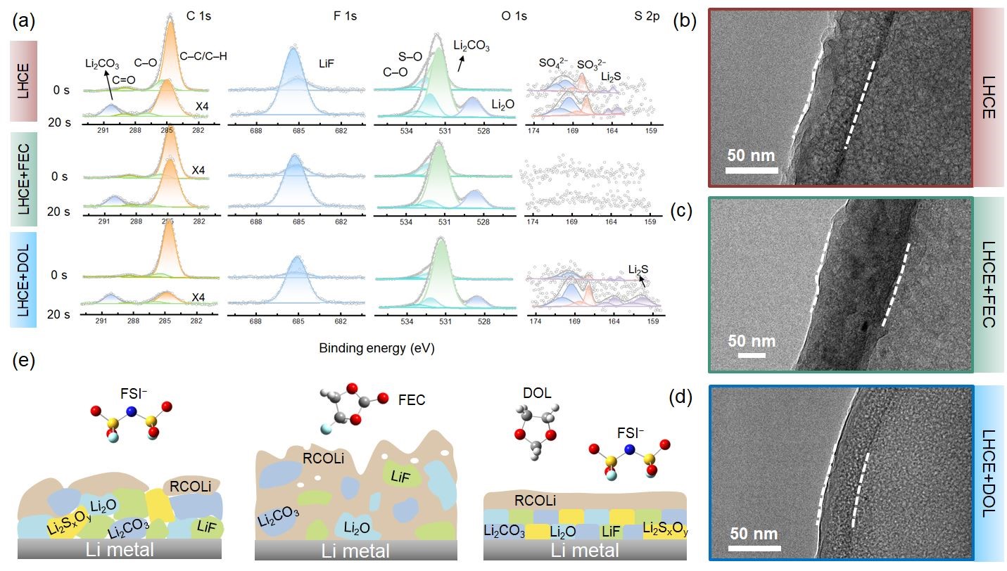不同的SEI化學(xué)/結(jié)構(gòu)特性直接影響鋰沉積/脫除行為和SEI的動(dòng)態(tài)重構(gòu)過程,進(jìn)而產(chǎn)生不同dead Li0和SEI Li+增長(zhǎng)速率。系統(tǒng)性的研究表明,1,3-二氧環(huán)烷(DOL)介導(dǎo)了均勻有序?qū)訝頢EI的產(chǎn)生,有助于提高鋰金屬沉積的均勻性以及SEI的循環(huán)穩(wěn)定性,同時(shí)降低SEI Li+和dead Li0的增長(zhǎng)速率。